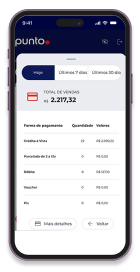 O aplicativo da Punto é um canal digital voltado para os nossos estabelecimentos credenciados, apresentando uma visão simples e completa do seu negócio.