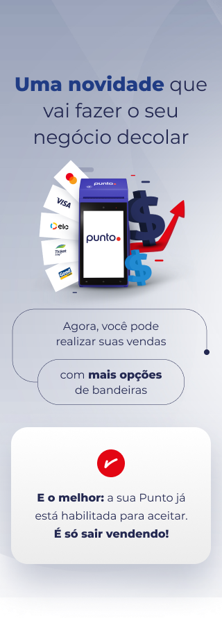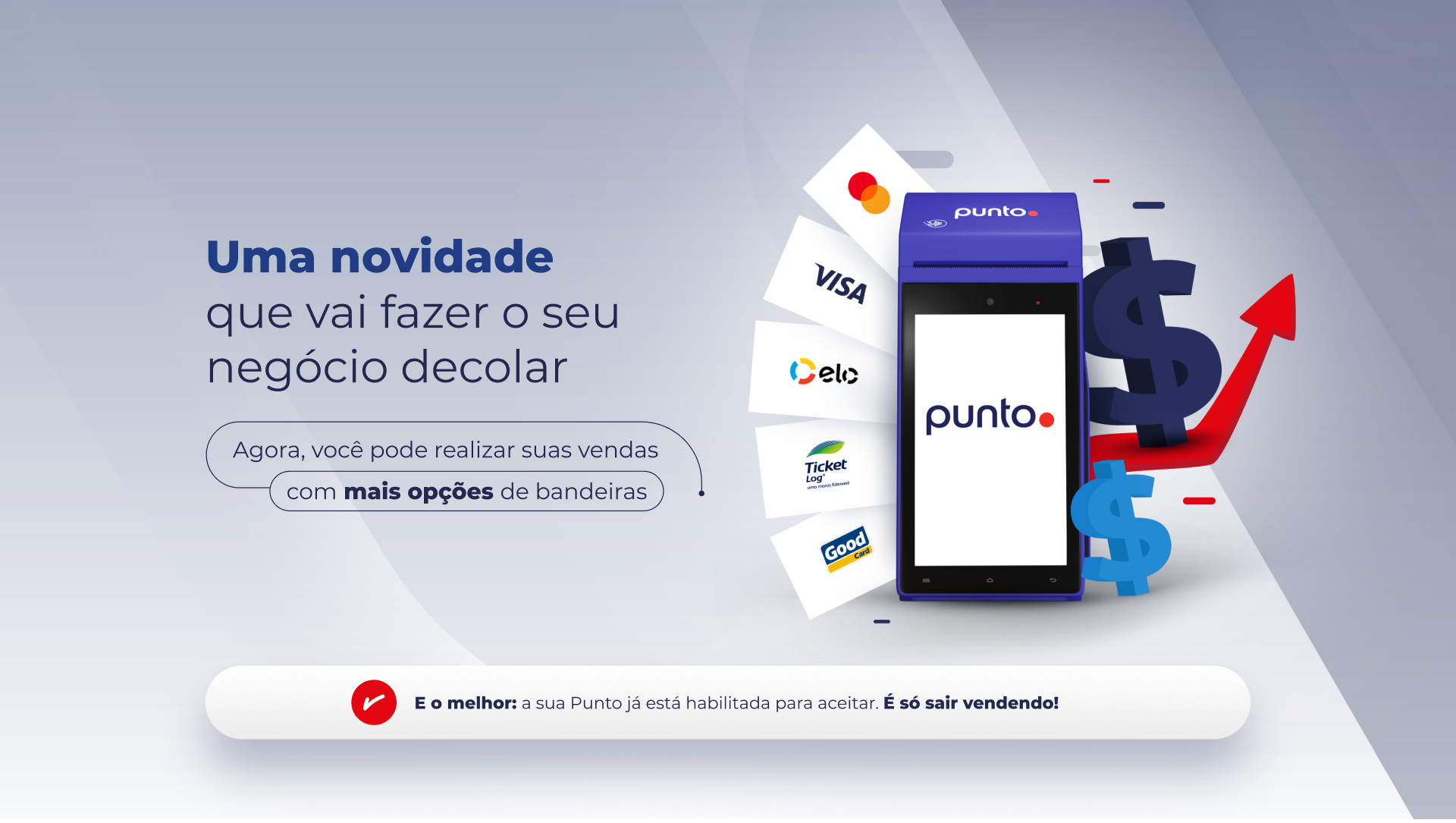 Atualmente, além da Ticket Log e GoodCard, a Punto também aceita as bandeiras Visa, Mastercard e Elo. Como estamos sempre em evolução, em breve teremos mais bandeiras disponíveis para você vender muito!